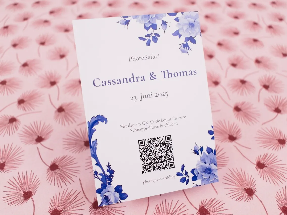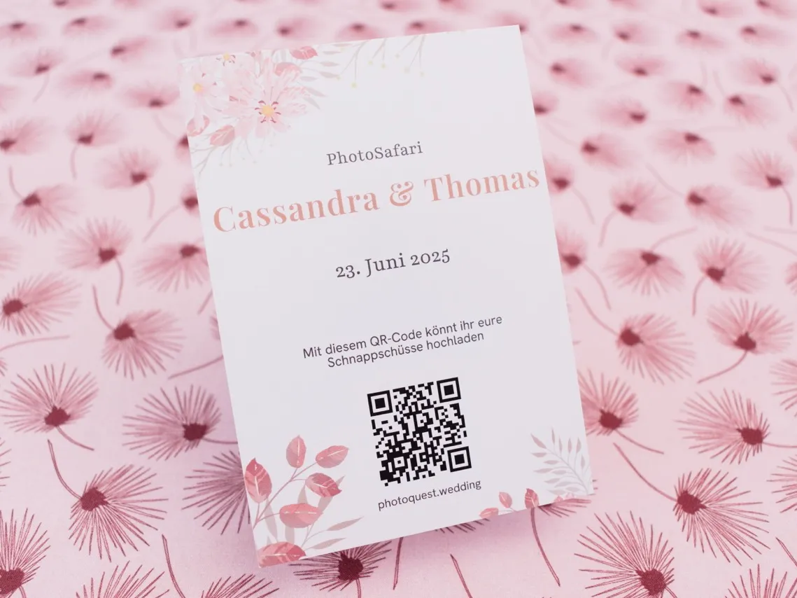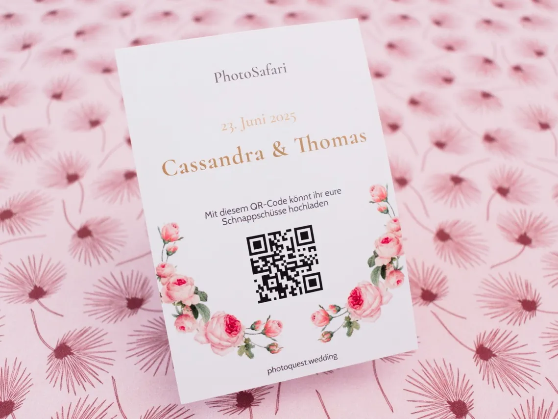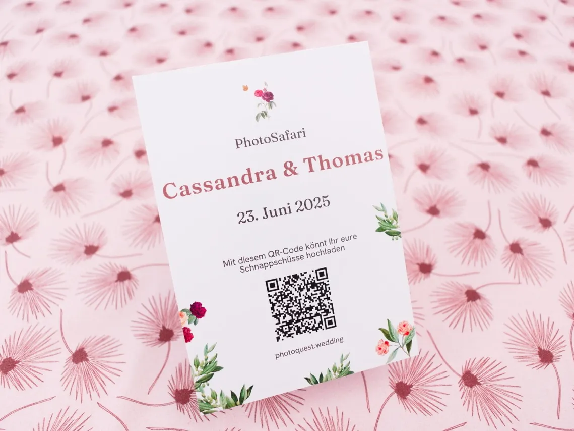 Verteilt die Safari Karten auf jedem Tisch und keine Fotos gehen verloren. Jede wunderschön gedruckte Karte hat einen QR‑Code – dies macht es deinen Gästen kinderleicht ihre spontanen Schnappschüsse hochzuladen. 📸✨